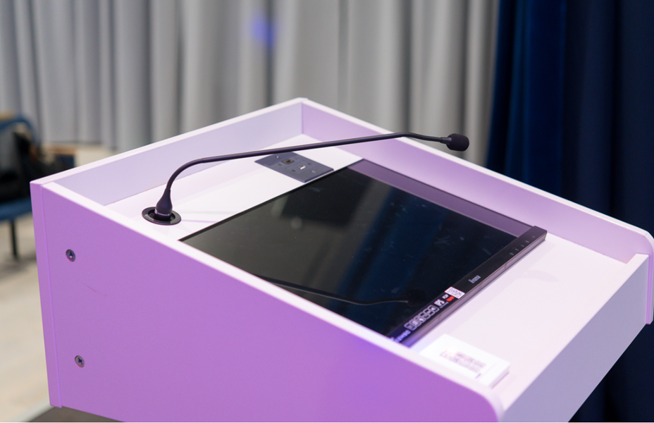 Клаcсический подиум для преподавателя с встроенным сенсорным монитором, микрофоном и оборудованием для управления цифровым контентом.