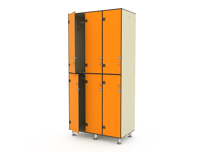 Шкаф трехсекционный двухъярусный прекрасно подойдет для раздевалки спортзала, бассейна или организации пространства и системы хранения одежды учащихся в школьном гардеробе. Наполнение каждой ячейки: штанга, крючок, замок механический. Установлен на регулируемых ножках.