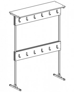 Вешалка напольная, двухсторонняя, оснащена 24 крючками. Каркас выполнен из металлической трубы квадратного сечения 25х25 мм, с полимерно-порошковой окраской в светло-серый цвет. Крючки расположены на панелях из ЛДСП 16 мм. с кромкой ПВХ 0.45 мм.