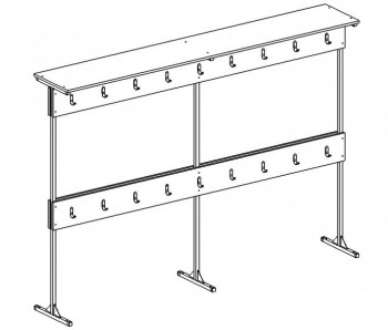 Вешалка напольная, двухсторонняя, оснащена 36 крючками. Каркас выполнен из металлической трубы квадратного сечения 25х25 мм, с полимерно-порошковой окраской в светло-серый цвет. Крючки расположены на панелях из ЛДСП 16 мм. с кромкой ПВХ 0.45 мм.