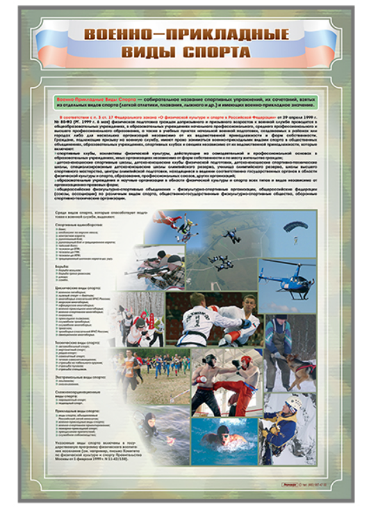 Стенд представляет собой информационную панель, на которой размещены сведения о военно-прикладных видах спорта, а также выдержки из Федерального закона "О физической культуре и спорте в Российской Федерации".