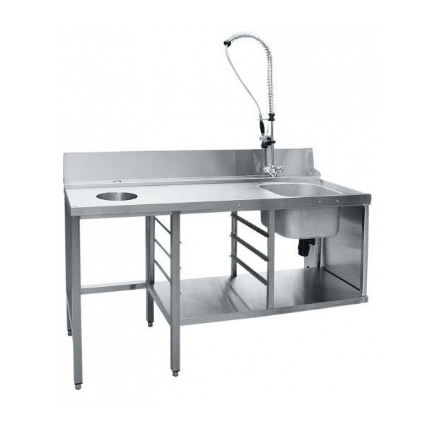 Стол предмоечный СПМП-6-7 имеет цельнотянутую ванну для предварительного ополаскивания посуды (400х400х250 мм), душирующее устройство для холодной и горячей воды, регулируемые по высоте ножки, нижнюю полку и направляющие для установки трех кассет 500х500 мм. Крепление к посудомоечной машине осуществляется с помощью верхнего зацепа и нижних винтов. Путем несложного монтажа стол можно установить как в левом, так и правом исполнении.