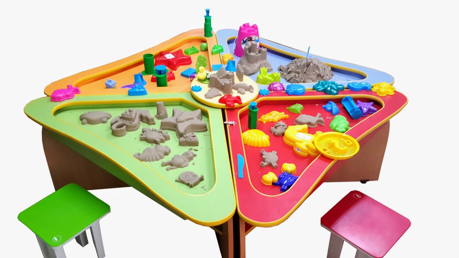 Красочный детский комплекс включают "лепестки-столешницы" разного цвета с полочками.